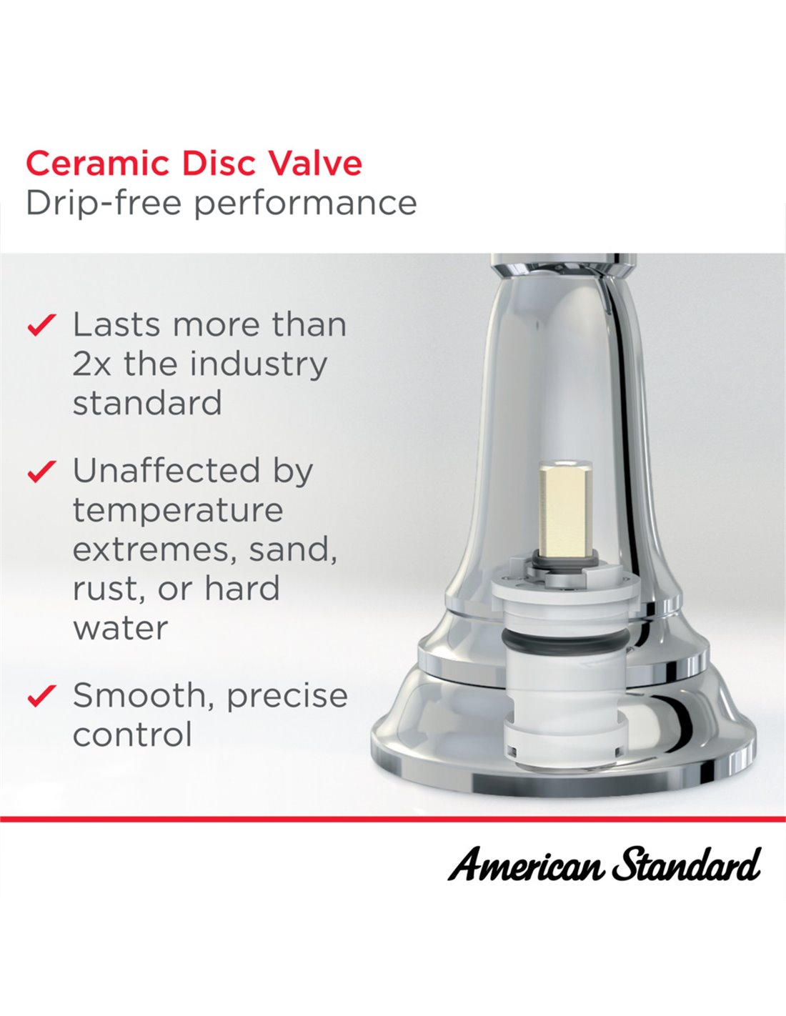 - Ceramic disc valves, drip-free for life