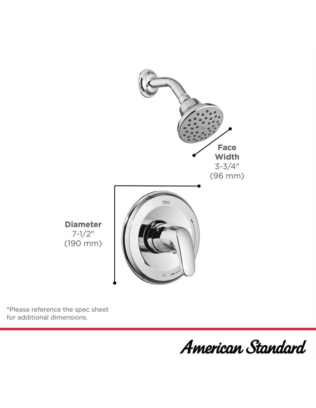 • Water-saving 3-3/4" (96 mm) showerhead, 1.75 gpm/6.6 L/min maximum flow