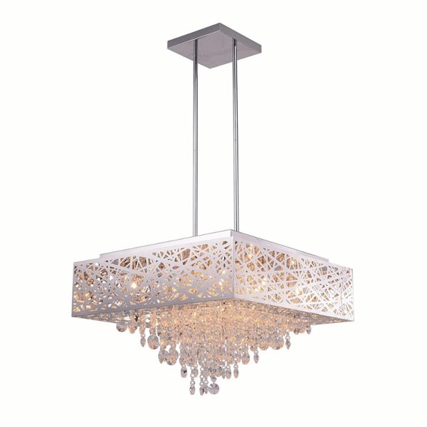 A lighting fixture of understated elegance. The Eternity 12 Light Chandelier displays charming crystal threads dangling in inverted pyramid style from the inside of a rectangular drum shade. This glam light is the perfect accent piece to spruce up your bedroom, dining area, living room, or entertainment room.