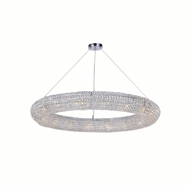 A true stunner, this crystal halo chandelier will lend a glorious glow to anywhere it is placed. The delicate and elegant Veronique 16 Light Chandelier features an oversized circular frame measuring 40 inches in diameter. The chrome frame is beautifully wrapped with glistening crystals. This bright and sparkly light fixture will look gorgeous above a dining table, on a formal sitting room, and even in your home's primary bedroom.Lighting is jewelry for the home, and there is the perfect piece for every room. This fixture is done in a beautiful chrome finish which could be the missing piece to lighten up and fall in love with your space all over again.