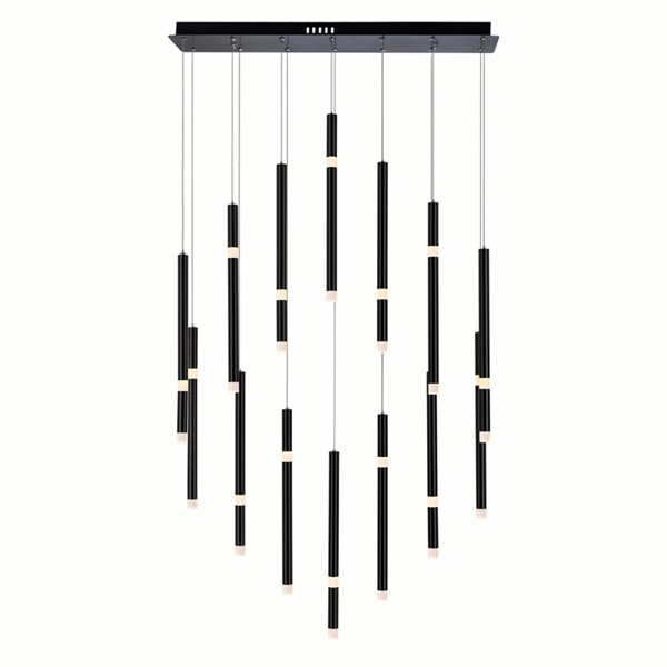 Add personality to your living room with this Flute 14 Light Chandelier in black finish. A rectangular canopy holds 14 chime-like bulbs that are compact and customizable. Adjust the height to create a symmetrical or asymmetrical display of light. The tip of each vertical bar gleams a mellow light perfect for creating a relaxing and inviting ambiance in your living space.Lighting is jewelry for the home, and there is the perfect piece for every room. This fixture is done in a beautiful black finish which could be the missing piece to lighten up and fall in love with your space all over again.