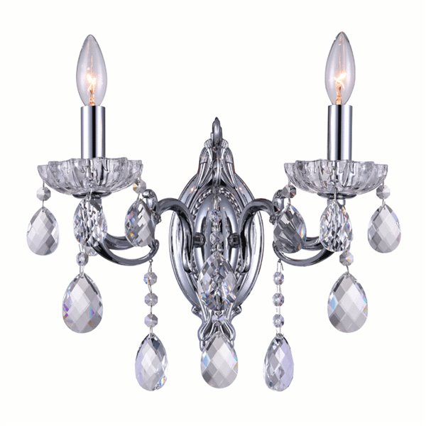 This Flawless 2 Light Chrome Wall Sconce will bring any space in transit to two style destinations - the past and the present. This transitional wall light displays a then-and-now charm with its candelabra arms and faceted crystal trimmings. Perfect for the bathroom, a narrow hallway, for flanking a mirror in the entryway or an art piece in the dining room, this wall-mounted light source will provide not just an added layer of illumination but also a new layer of character to any space.Lighting is jewelry for the home, and there is the perfect piece for every room. This fixture is done in a beautiful chrome finish which could be the missing piece to lighten up and fall in love with your space all over again.
