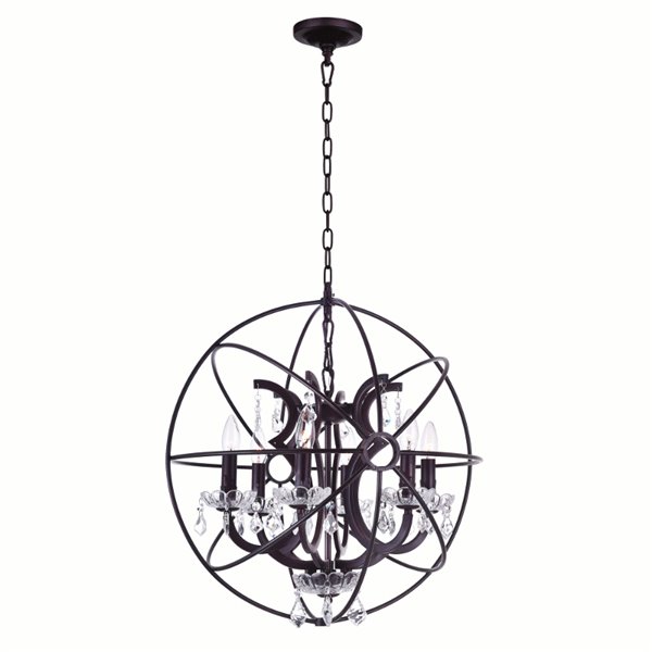 Make a statement with this gorgeous orb chandelier. It has a beautiful spherical cage adorned with a candelabra base with clear crystal candelabra plates and dangling embellishment. Perfect for the living room, dining space, entryway, or even the bedroom, this Campechia 6 Light Chandelier will be one dramatic and functional piece of home jewelry that your place will benefit from.Lighting is jewelry for the home, and there is the perfect piece for every room. This fixture is done in a beautiful brown finish which could be the missing piece to lighten up and fall in love with your space all over again.