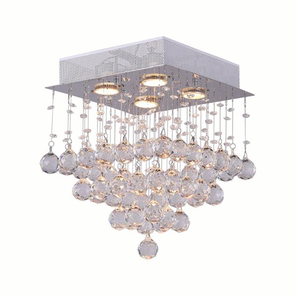 Give a room all the glitz and glamour of a jewelry store with the Square 4 Light Flush Mount. This chrome light fixture has a square canopy holding strands of crystals with faceted crystal ball tips. The refined design really shines without looking too blingy. This light fixture requires four GU10 bulbs.Lighting is jewelry for the home, and there is the perfect piece for every room. This fixture is done in a beautiful chrome finish which could be the missing piece to lighten up and fall in love with your space all over again.