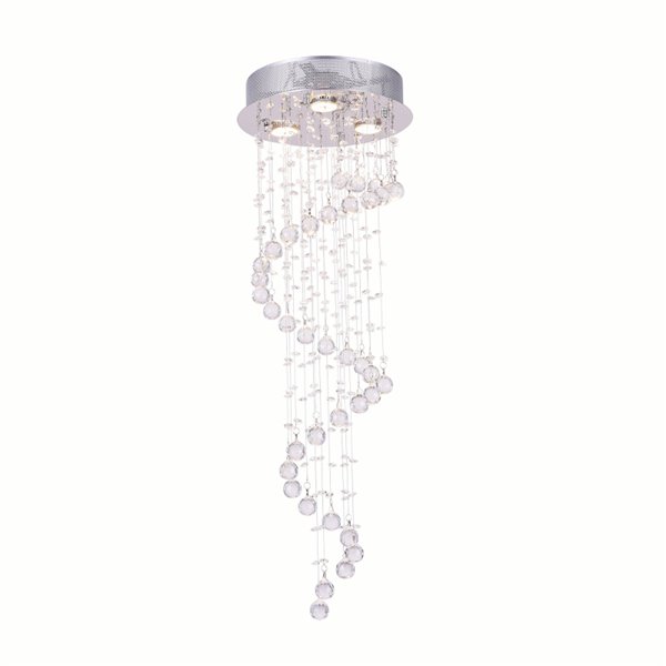 You don't need an extra enormous space to hang a cascading crystal chandelier. The Spiral 3 Light Flush Mount is a light fixture you can even when you have limited space. Measuring only 12 inches in diameter, with height at 34 inches, this light source offers a streamlined silhouette perfect for narrow stairwells or entryways with higher ceiling. Consider this glistening light fixture the everyday jewelry that will elevate the style of your humble abode.Lighting is jewelry for the home, and there is the perfect piece for every room. This fixture is done in a beautiful chrome finish which could be the missing piece to lighten up and fall in love with your space all over again.