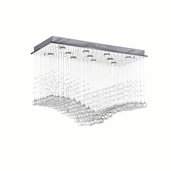This light source is definitely designed with grace and elegance in mind. Clear crystal drops dangling from a rectangular ceiling plate in chrome makes up the beauty of this light fixture. The Twinkle 36 inch 11 Light Flush Mount is a light fixture that will radiant sophistication over a dining table or a luxe kitchen island. Easily give your space a high-end finish with this dazzling source of light.Lighting is jewelry for the home, and there is the perfect piece for every room. This fixture is done in a beautiful chrome finish which could be the missing piece to lighten up and fall in love with your space all over again.