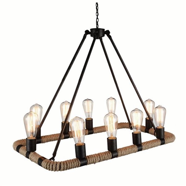 The oversized Ganges 10 Light Chandelier displays a handsome mixed material look. The rectangular frame with rounded edges is covered in hemp rope and is anchored by four slim rods. This rustic industrial light source goes well in a dining room, kitchen, entertainment room, or man cave.Lighting is jewelry for the home, and there is the perfect piece for every room. This fixture is done in a beautiful brown finish which could be the missing piece to lighten up and fall in love with your space all over again.