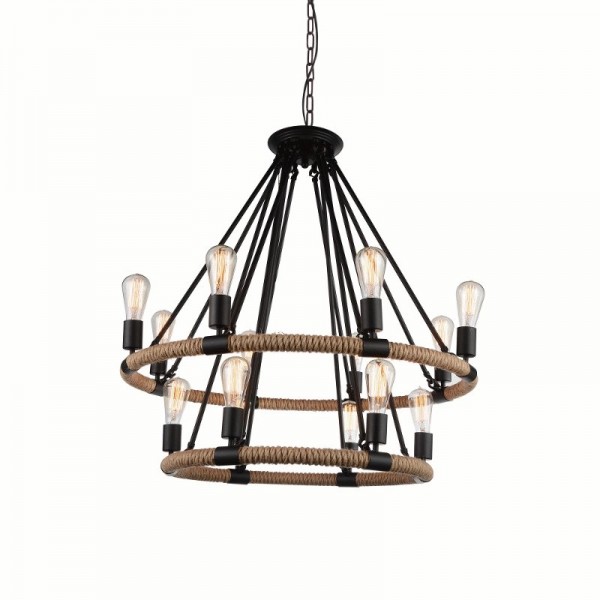 The Ganges 14 Light Chandelier will add warmth to wherever it is placed. This up chandelier features a two Tiered round frame covered in hemp rope. Black metal rods anchor the circular frame. Exuding a rustic industrial vibe, this oversized light source will add a nice vintage touch to any space.Lighting is jewelry for the home, and there is the perfect piece for every room. This fixture is done in a beautiful black finish which could be the missing piece to lighten up and fall in love with your space all over again.