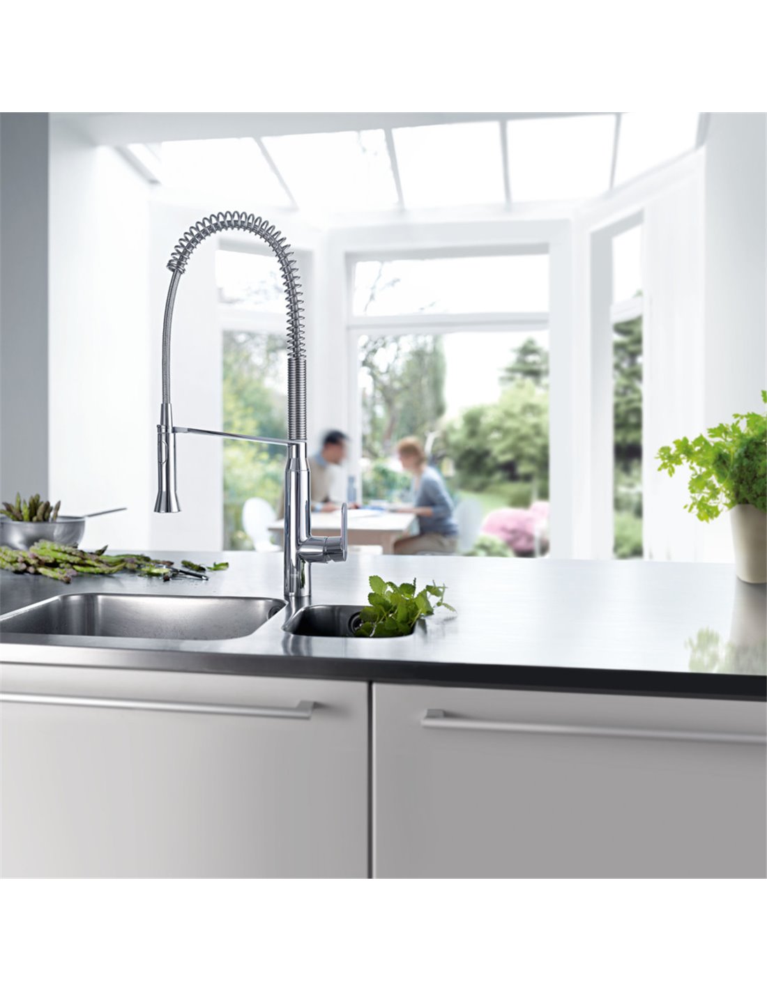 Designed to make a statement, the K7 Single-Handle Semi-Pro Dual Spray Kitchen Faucet from GROHE is durable, dependable, and features a high spout to give your kitchen a true professional look. Spring arm provides an extensive operating radius within the sink and swivels 360° for added versatility in a center island. High spout and dual spray functions make every kitchen task easier, from filling pots to cleaning the sink and rinsing vegetables.