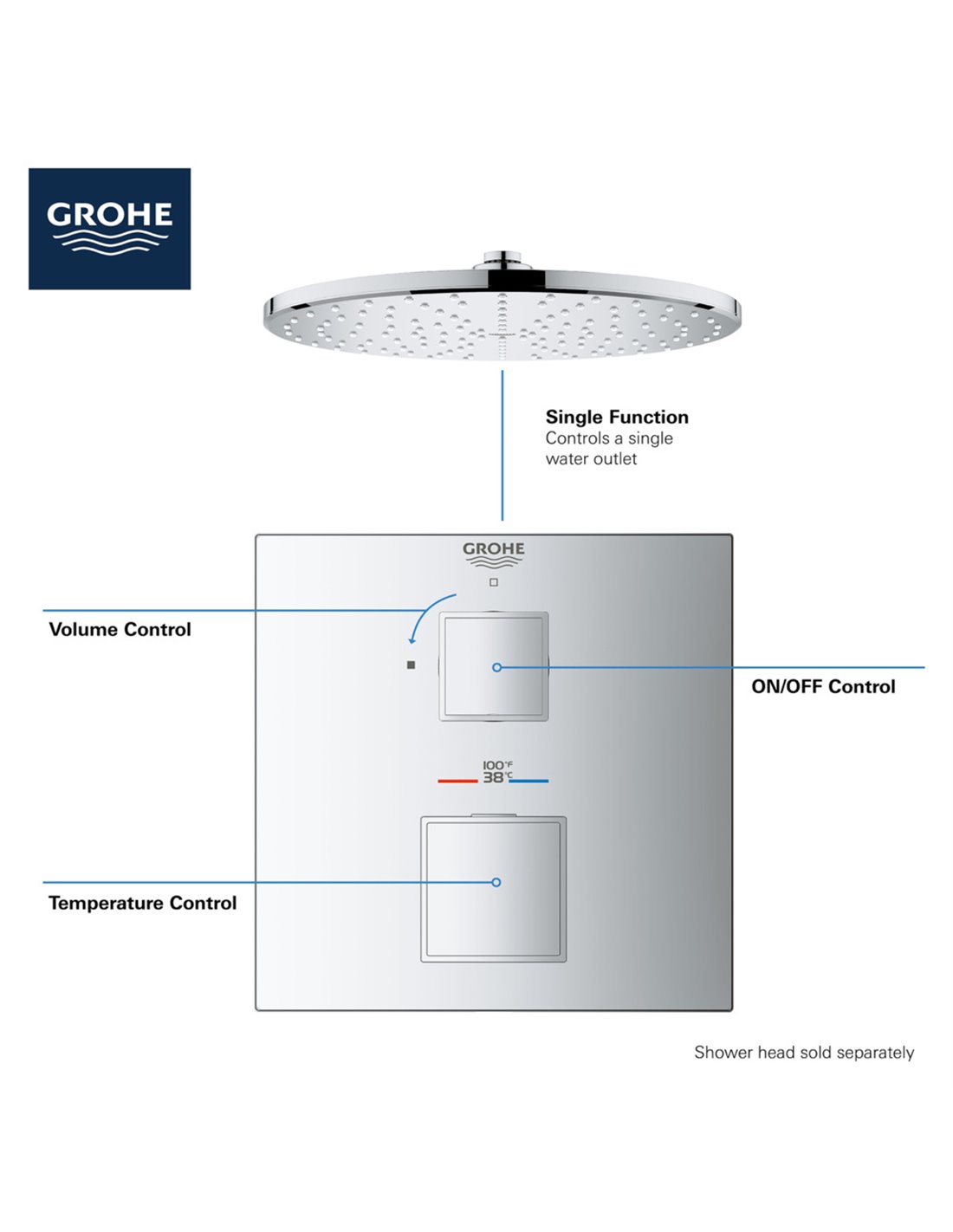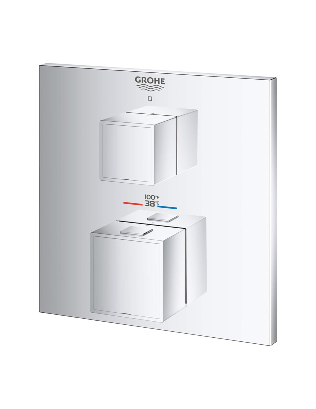 From its artful cube profile to its intuitive operation, the GROHE Grohtherm Cube Single Function 2-Handle Thermostatic Trim with Control Module lends clean, geometric lines to a contemporary bathroom. Thoughtfully designed for comfort and enjoyment, Grohtherm features an upper handle to control volume and on/off, a lower handle to control temperature, GROHE Turbostat to maintain consistent temperature, and GROHE SafeStop to prevent scalding. It’s the perfect combination of style and substance in today’s home.