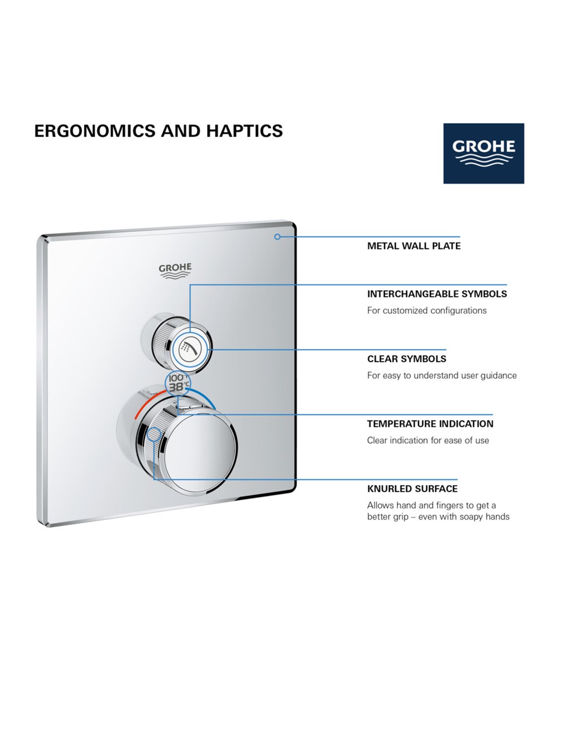 - GROHE SmartControl is easy and intuitive: push for on/off, turn for volume adjustment