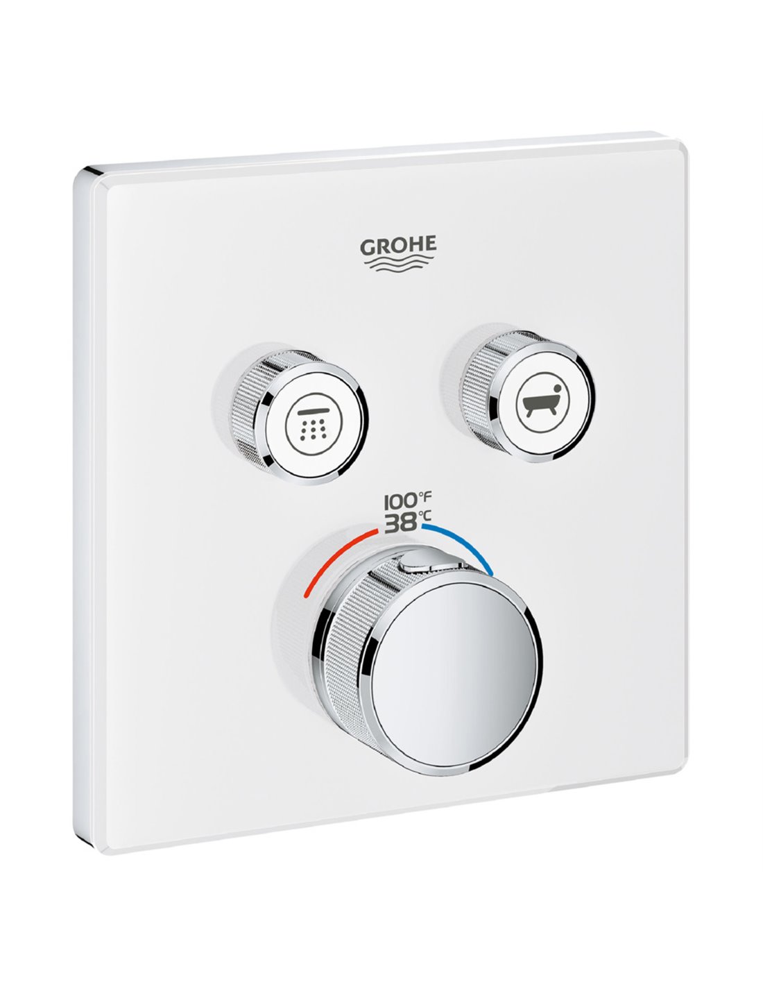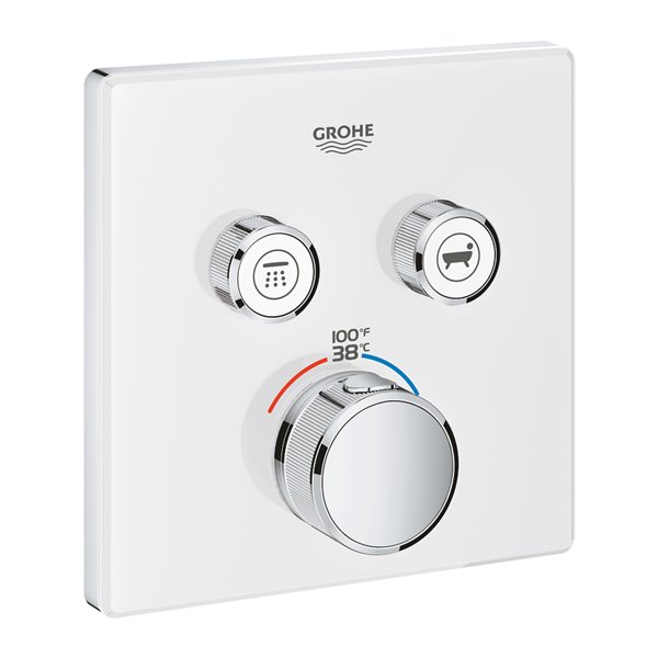 Grohtherm SmartControl – break the mold with this chic, slim thermostat offering total flexibility Choose a thermostat that is as flexible as possible for your most enjoyable shower or bath ever. Packed with useful features, the Grohtherm SmartControl concealed thermostat features a minimalist design and stylish Moon White that will enhance any modern bathroom. The innovative SmartControl technology allows you to select your desired spray source and adjust the water volume at the push-turn of a button. The three valves offer total flexibility, whatever your shower set up – you can control, switch between or even combine different spray patterns and water outlets – perfect for spaces where you want to have hand, head and side showers, as well as a bath. Integrated GROHE Turbostat technology prevents any unpleasant temperature fluctuations. GROHE EasyLogic markings and textured buttons with exchangeable symbols make it easy and intuitive to use. Family-friendly, the GROHE SafeStop override button allows you to set a maximum temperature of 100° F/38° C to prevent scalding. Water-saving GROHE EcoJoy technology gives you the option of a reduced flow rate with no compromise on enjoyment. Thanks to the GROHE QuickFix system it’s Swift and straightforward to install. The slim profile makes it easy to keep clean, and the chic, durable GROHE StarLight Moon finish will look pristine for years to come. With a slim, round design perfect for that minimalist, streamlined look, this product is bound to enhance your bathroom scheme. Please note that this product must be installed in combination with the GROHE Rapido SmartBox (35601000).