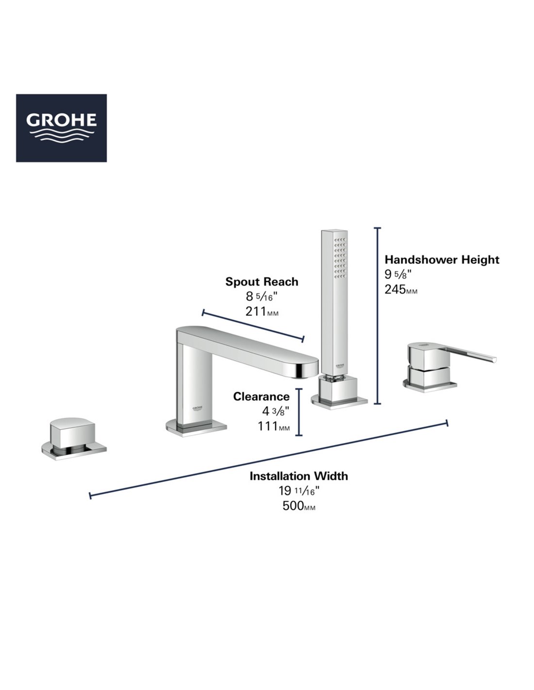 Elegant or minimalist, the GROHE Plus Roman Tub Filler with Hand Shower combines the clean, linear angles of a cube with the gentle curves of a circle making it a distinctive choice no matter the design aesthetic. Engineered to bring comfort and convenience to your bathroom, the Plus Roman Tub Filler features the durable GROHE StarLight coating for easy care and lasting beauty.