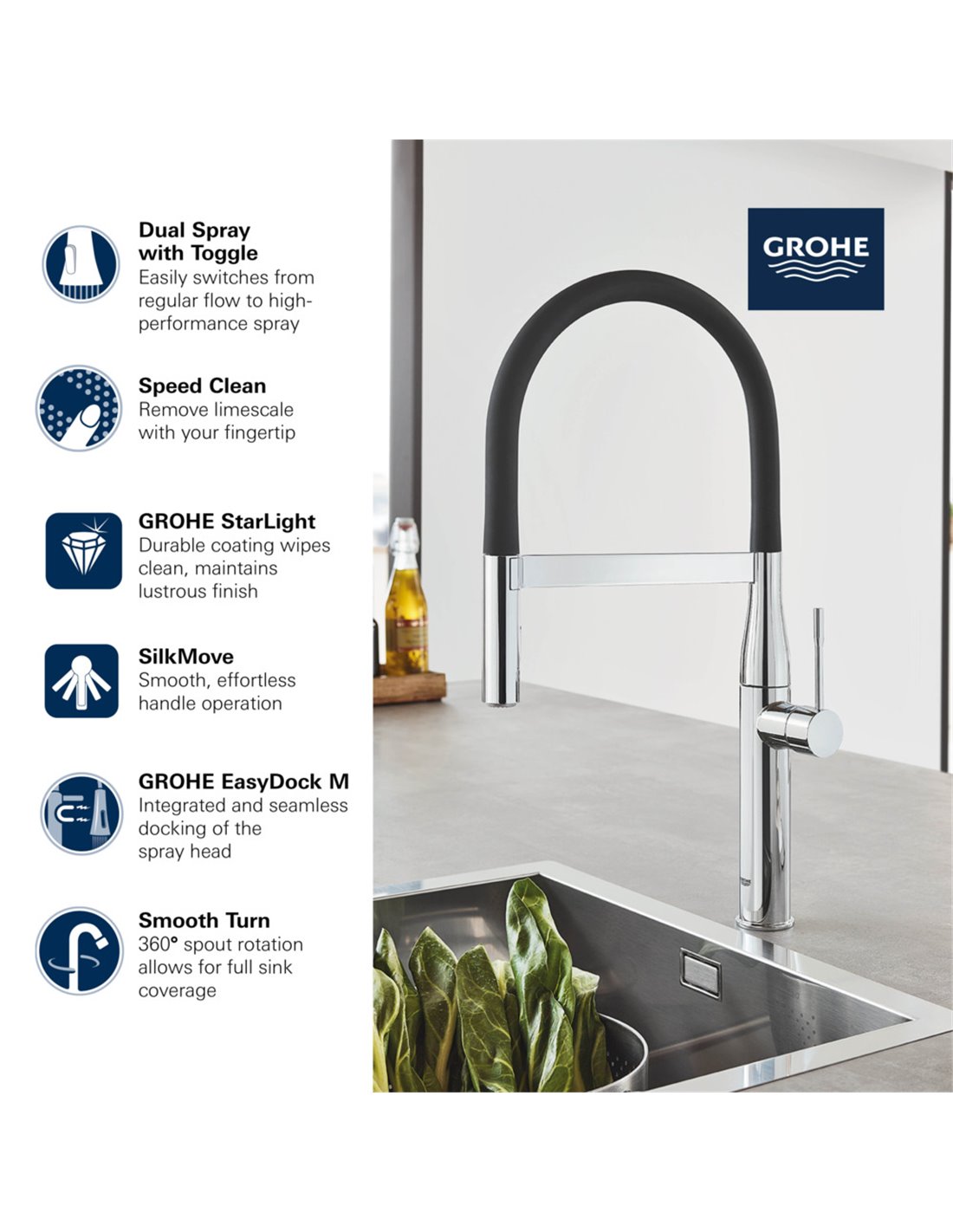 - EASY TO CLEAN: Kitchen faucet sprayer features GROHE SpeedClean rubber nozzles to quickly wipe away limescale with your fingertip