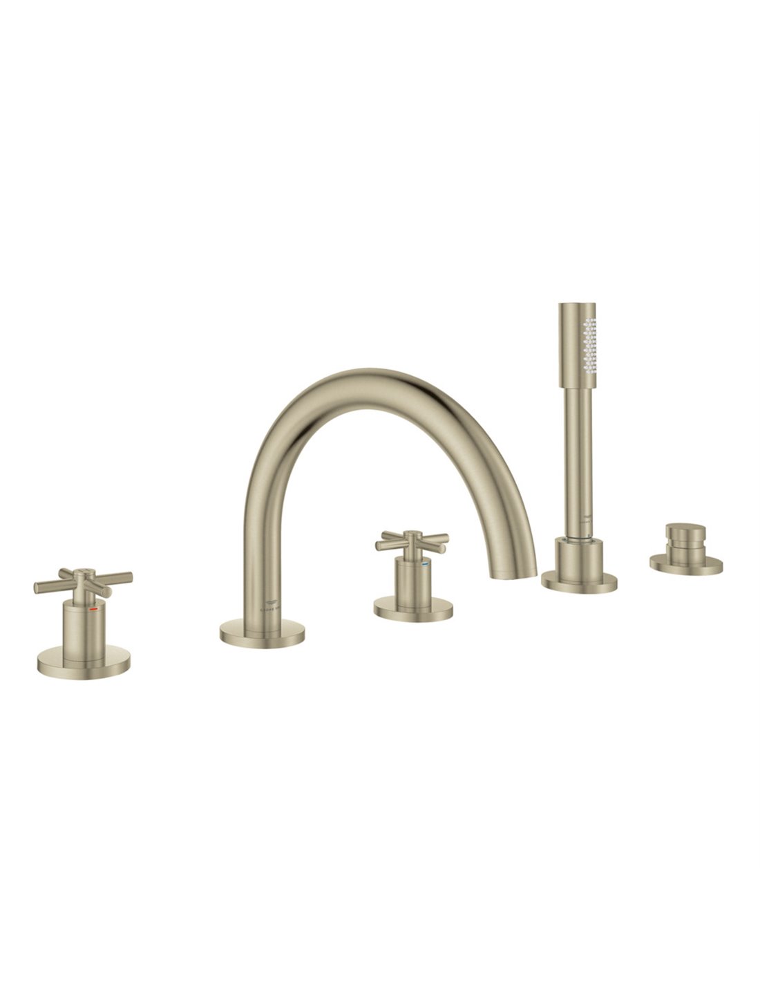 The GROHE SPA Atrio 5-Hole Roman Tub Filler with Hand Shower enhances a soothing, at-home spa setting with its clean, minimalist design. Precision crafted, this solid brass tub filler is engineered to deliver an exceptional experience, ensuring superior functionality and visual beauty in today’s most luxurious bathrooms.