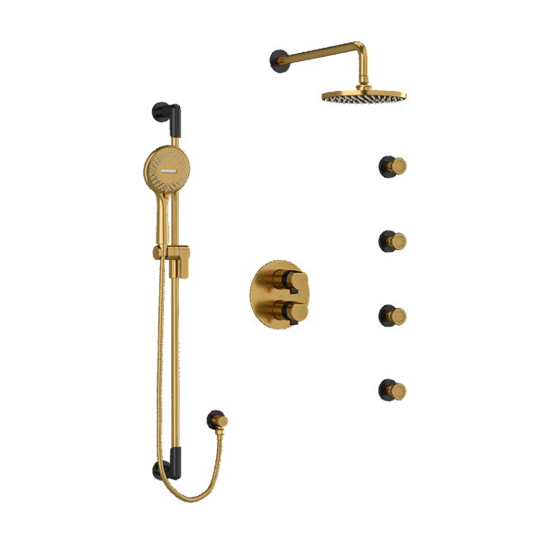 Riobel Parabola KIT446PB Type T/P thermostatic/pressure balance double coaxial system with hand shower rail, 4 body jets and sho