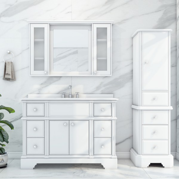 The Charm floor mount 48” vanity is perfect for uncluttering your bathroom experience. The 48” vanity has plenty of counter top space and ample storage with six beautifully crafted drawers placed along the sides and two doors across the center.
